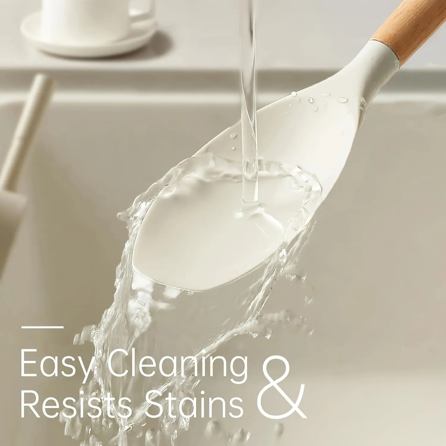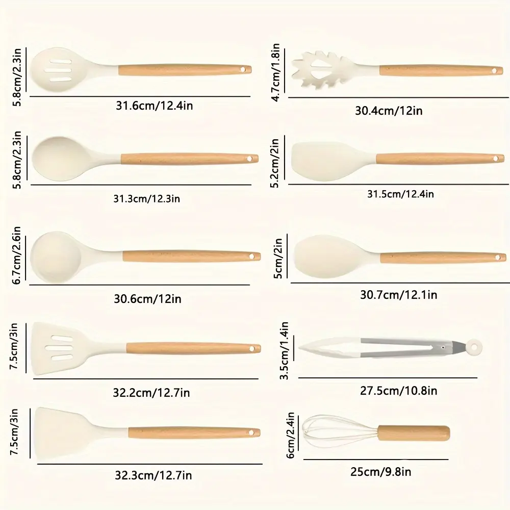 This 10-piece silicone utensil set is designed for everyday cooking and serving tasks. The silicone heads help support non-stick cookware by reducing direct contact with metal tools. Wooden handles provide a comfortable grip for controlled handling during stirring, flipping, and mixing. The set includes a range of common utensil shapes to cover different kitchen prep needs.
