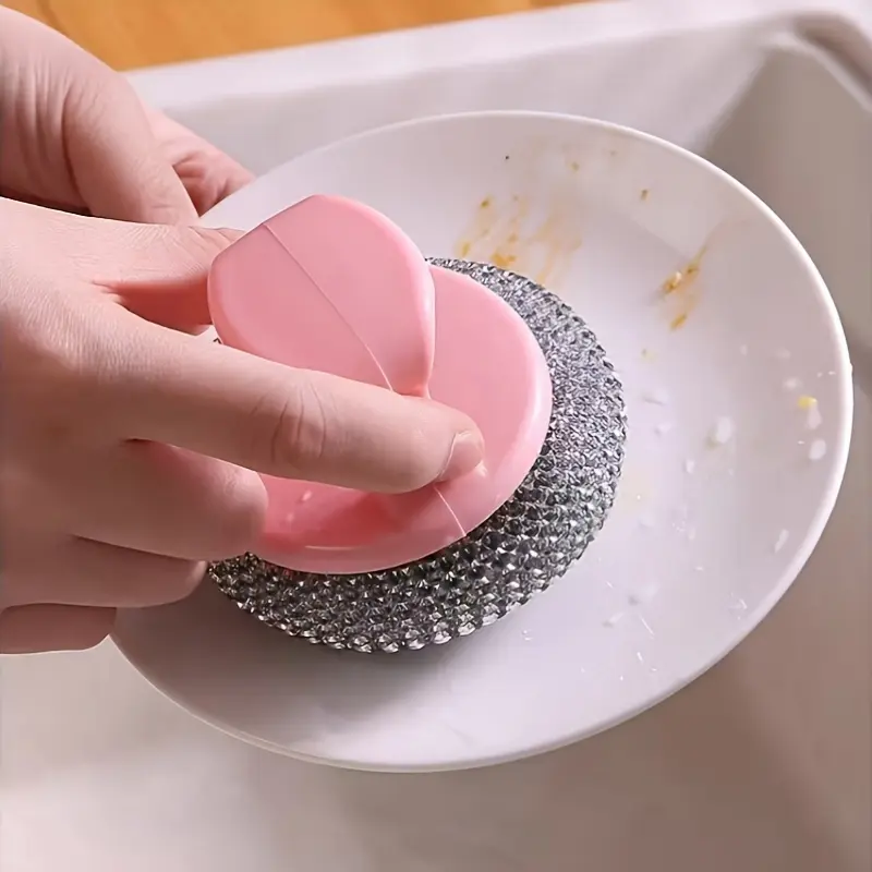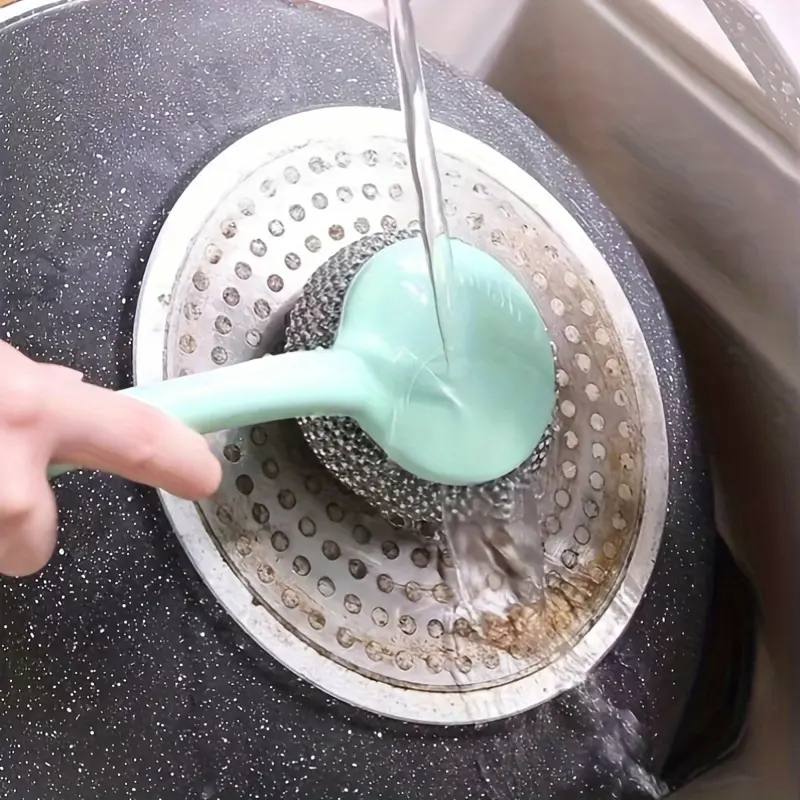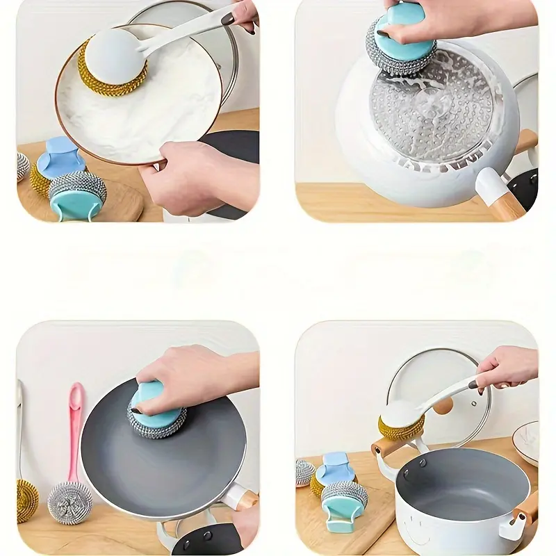 This detachable pan scrubber set is designed for cleaning cookware surfaces without heavy scratching. The non-stick style scrubber head helps lift residue during routine washing. Each piece includes a handle for controlled grip and reach while scrubbing. The washable design supports repeated use and simple rinsing between cleaning tasks.