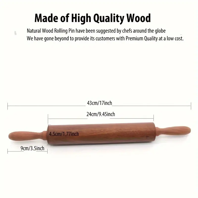 This 17-inch rolling pin is designed for rolling and flattening dough during baking preparation. The mahogany wood body provides a smooth, rigid surface for controlled pressure and even movement. Its long form factor helps cover more area with each pass for consistent shaping. Wipe-clean care supports routine kitchen use.