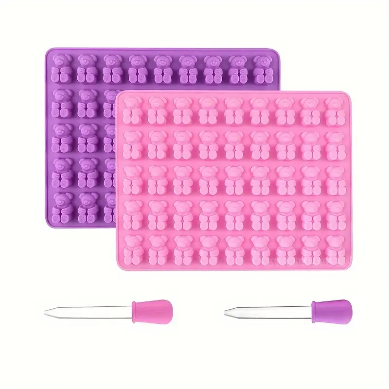 This silicone mold set is designed for forming small gummy bear shapes for candy and chocolate making. The 90-cavity layout supports making multiple pieces in one batch. Flexible silicone construction helps with releasing molded items and handling during filling. The set includes two droppers for controlled dispensing into small cavities.
