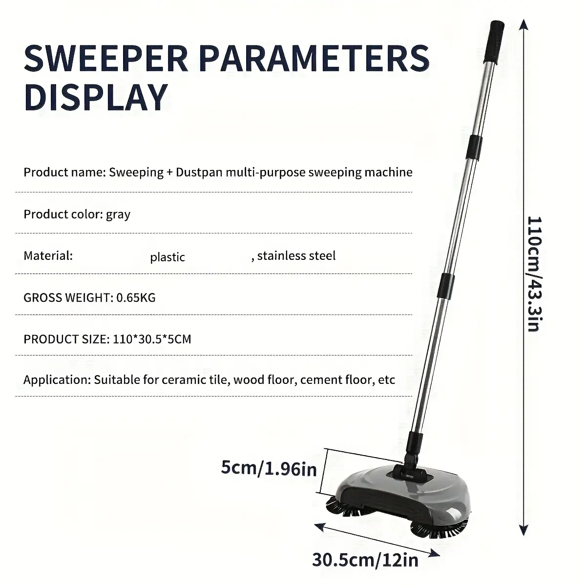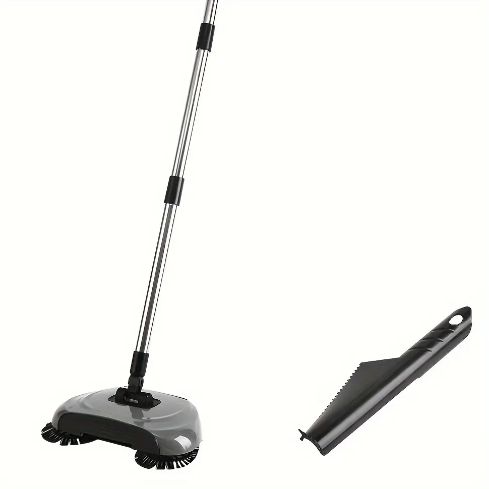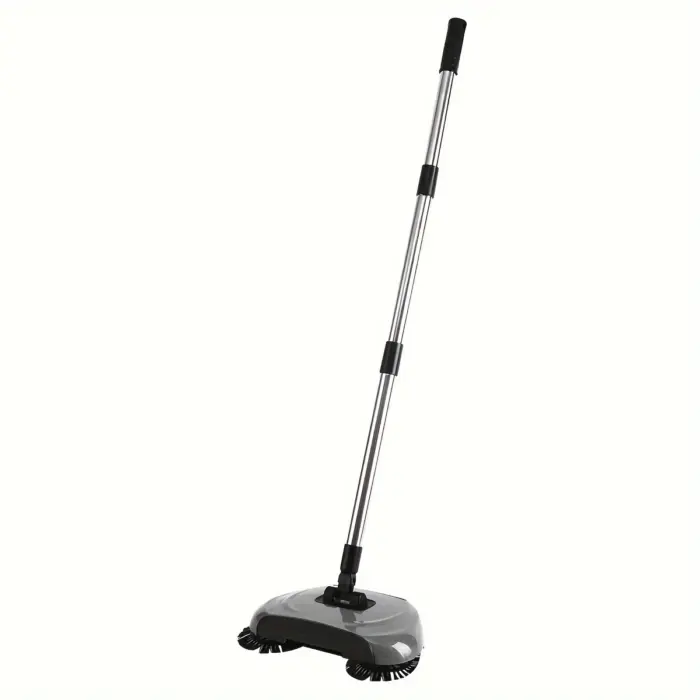 This manual push sweeper is designed for hard floor cleaning and collecting dry debris without electricity. The rotating brush mechanism helps guide debris into the included dustpan for quick pickup. An integrated mop component supports light surface wiping during routine cleaning. The adjustable handle helps fit different user heights and storage needs.