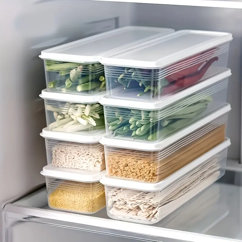 These stackable plastic storage containers with lids are designed for organizing and separating food items in a compact layout. The rectangular shape helps align containers neatly and supports efficient use of available space. Lids are included to help keep contents contained during storage and handling. The containers are reusable and intended for routine kitchen organization. Hand wash only to help maintain the container and lid fit over time.