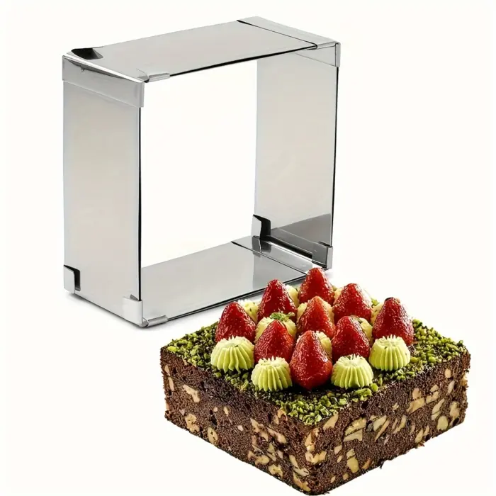 This adjustable stainless steel mold ring is designed for shaping and baking square or rectangular cakes. The size-adjustable frame helps you set the ring to fit different cake dimensions. A baking knife is included for handling and portioning baked goods. The metal construction is intended for repeated use and cleaning between bakes.