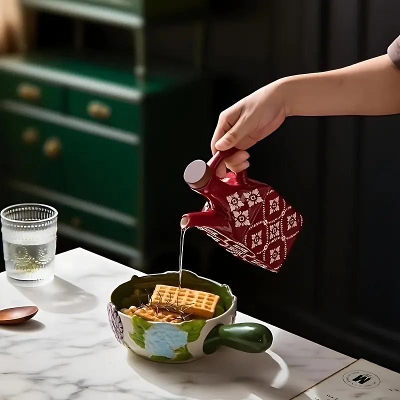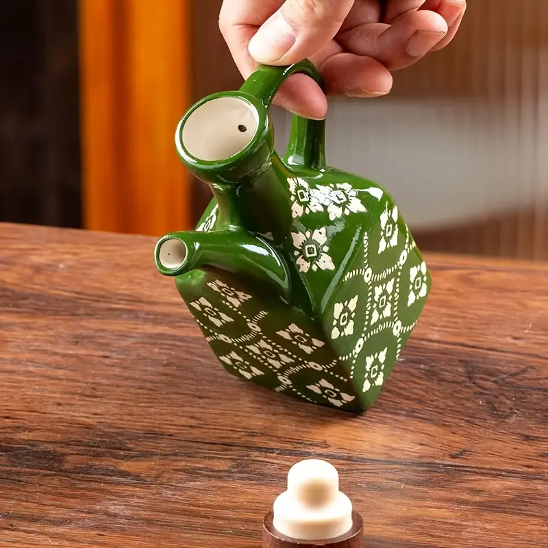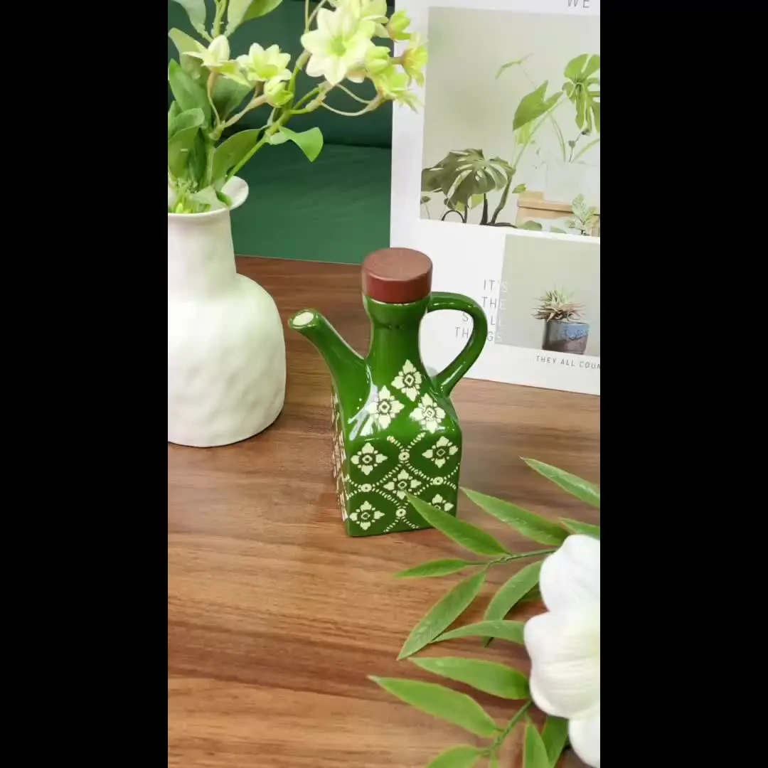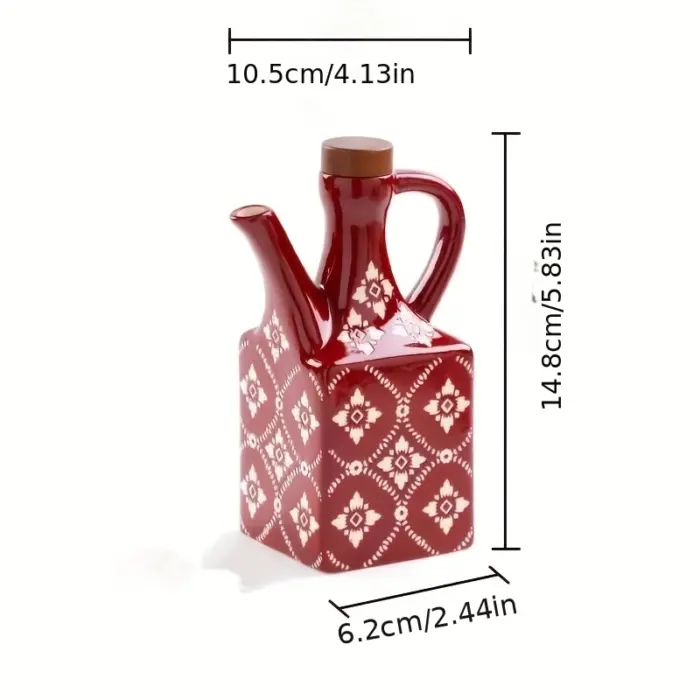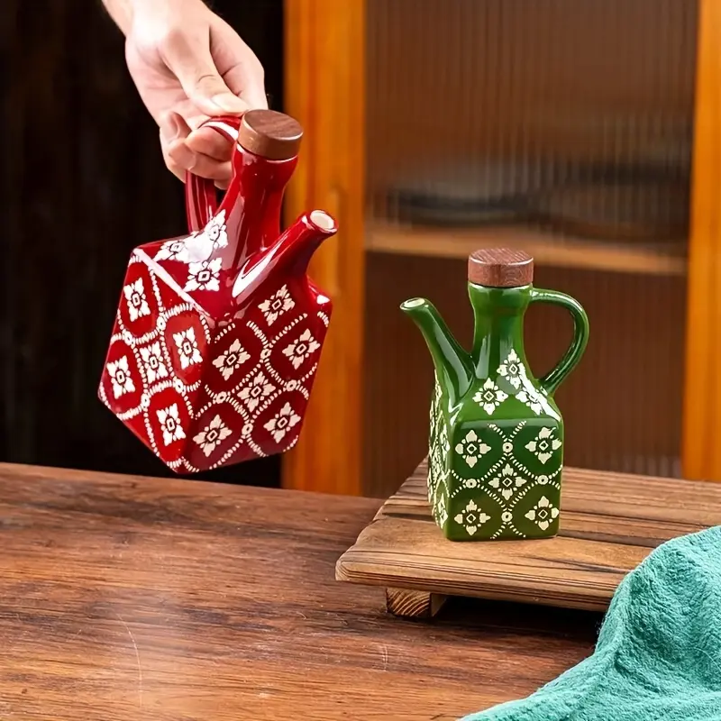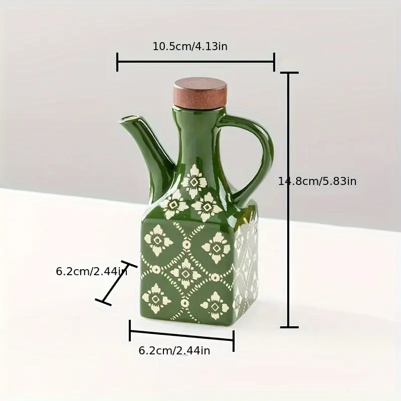 This ceramic bottle is designed for dispensing and serving oil, vinegar, and similar liquids. The square bottle shape helps provide a stable profile for everyday handling. A wood lid helps cover the opening between uses. Suitable for home meal prep and serving where controlled pouring is needed.