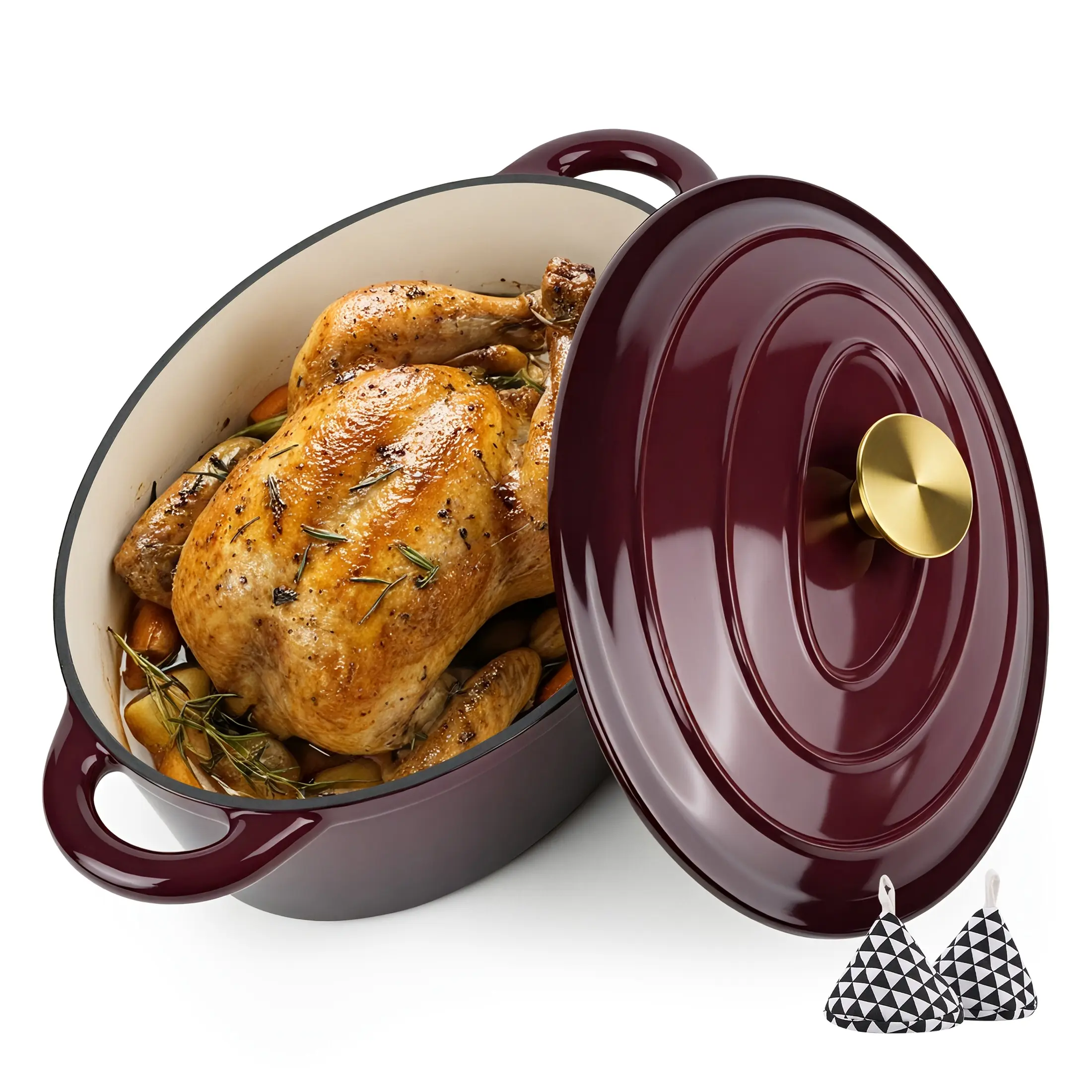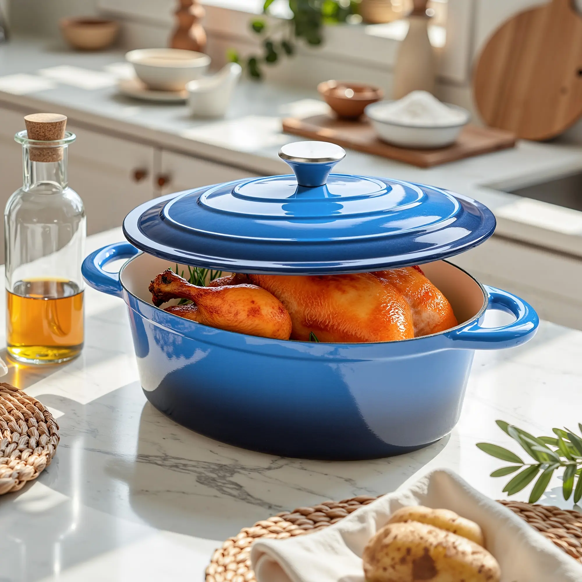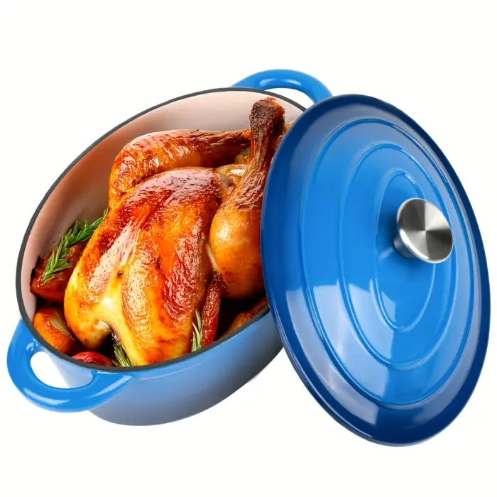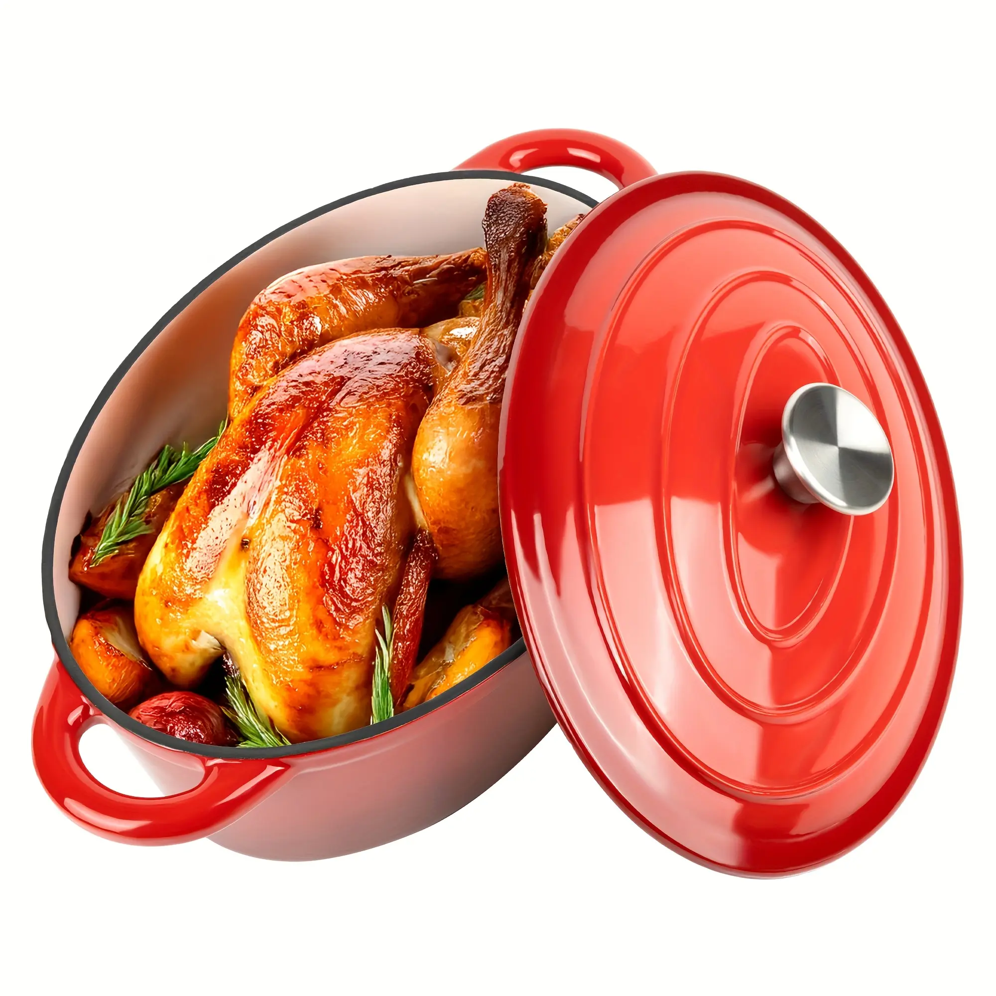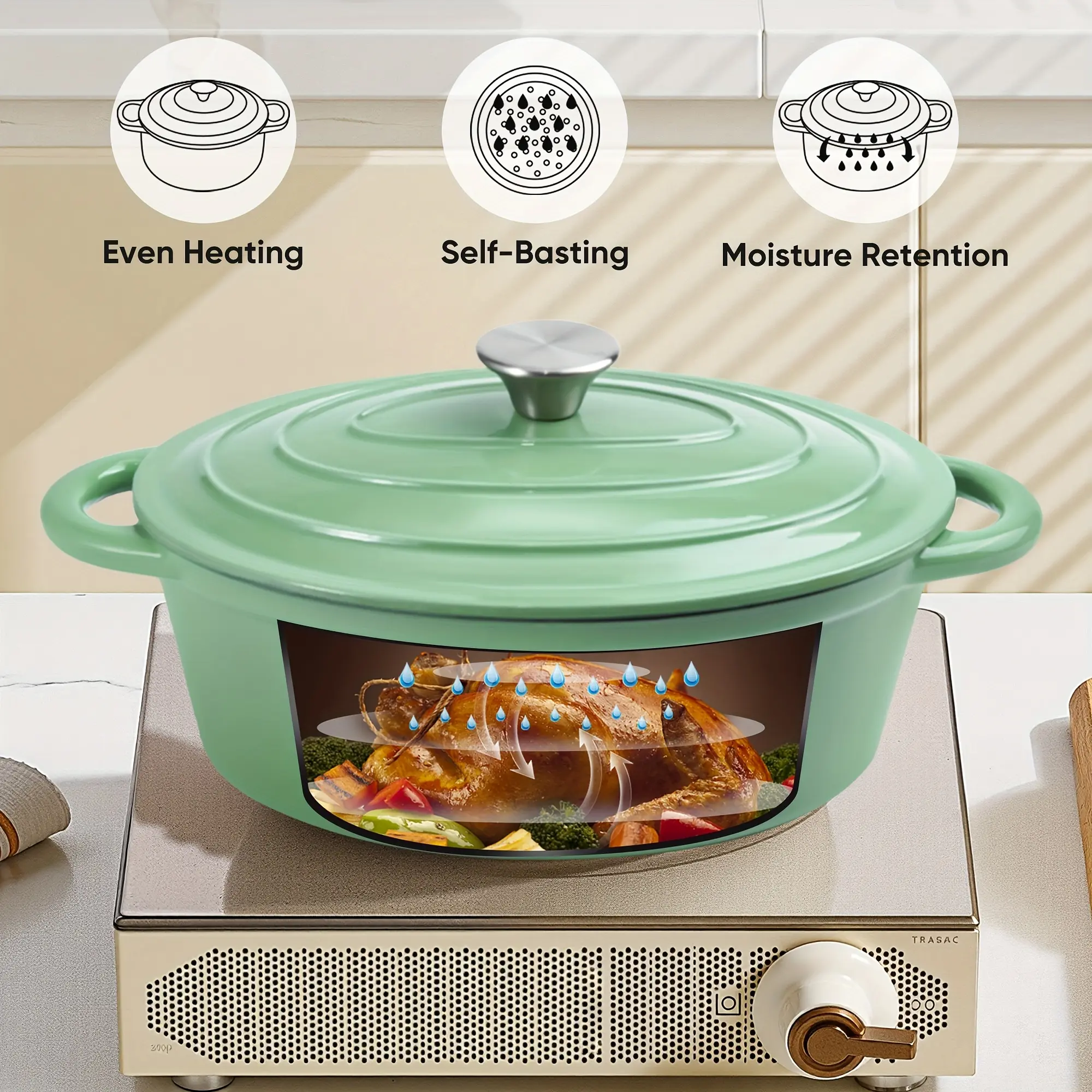 This enameled cast iron Dutch oven pot includes a fitted lid for covered cooking and baking. The heavy-duty construction is designed to support even heat interaction during stovetop and oven use. A smooth enamel-coated interior helps reduce sticking and supports easier cleanup. Dual side handles provide a stable grip for lifting and moving the pot. Suitable for a range of everyday cooking tasks that use a lidded pot.