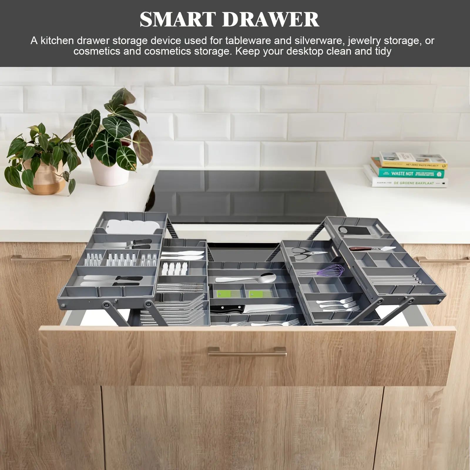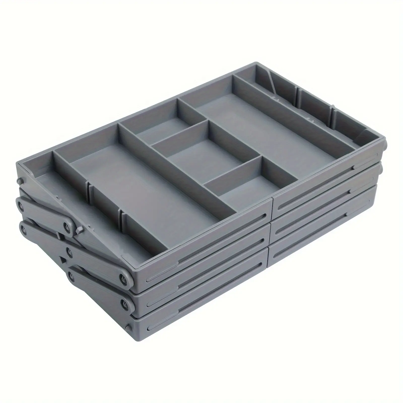 This foldable drawer storage box is designed to organize cutlery and small utensils in a compact layout. The expandable design adjusts horizontally to help fit different drawer widths. Multiple layers and compartments separate items to support quick sorting and access. Made from ABS material, it is intended for repeated everyday use and simple wipe-clean care.