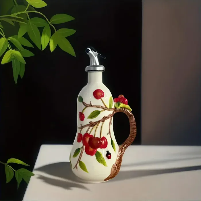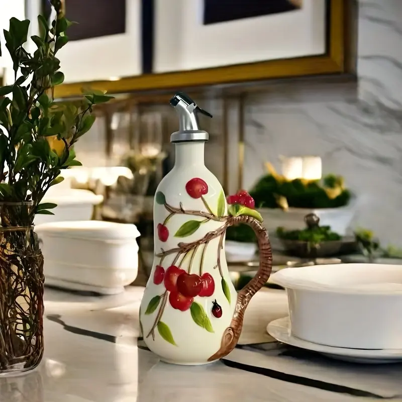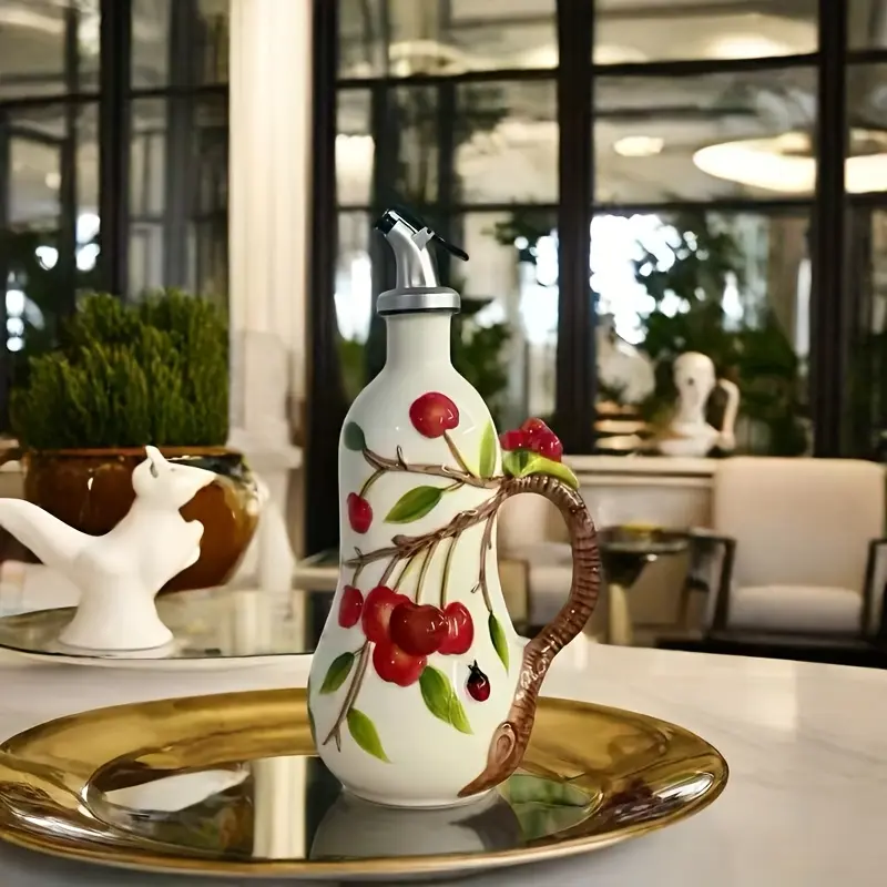 Elevate your kitchen with this elegant hand-painted ceramic jar, featuring a beautifully detailed cherry relief design. Crafted for both style and function, this versatile storage solution adds a touch of artistry to your countertop while keeping your favorite liquids organized and easily accessible.