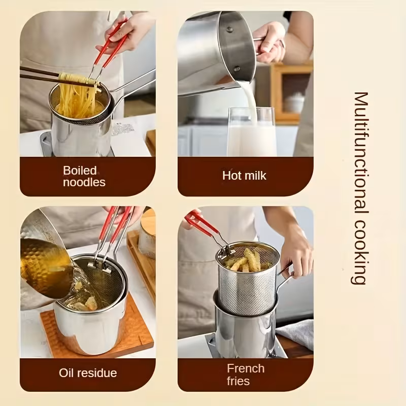 This stainless steel fryer is designed for manual deep frying during everyday cooking tasks. The compact metal form supports controlled heating and handling on the stovetop. Its simple structure allows routine use without electrical components. The cookware is intended for regular kitchen use with straightforward cleaning after frying.