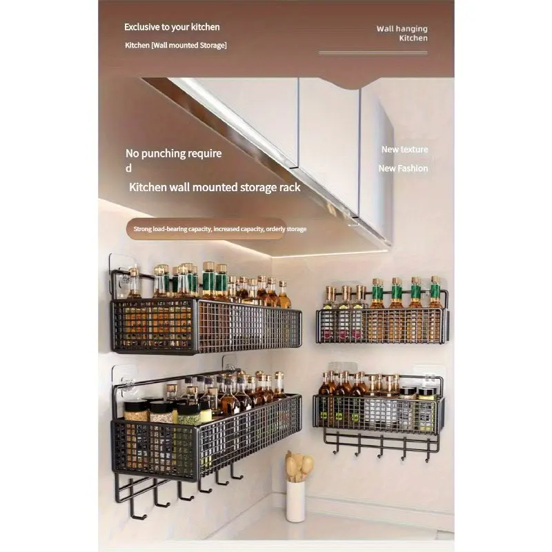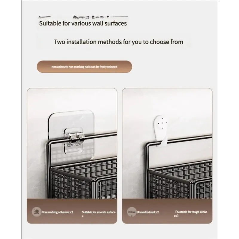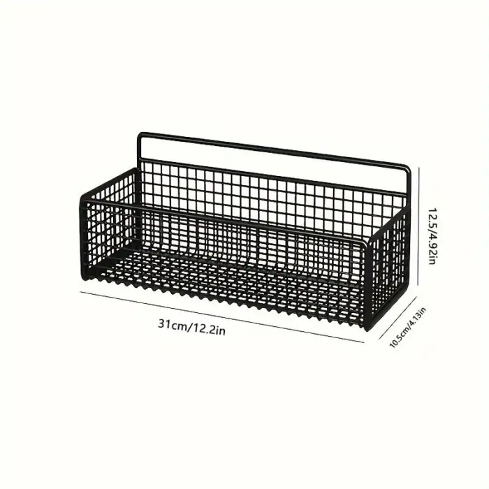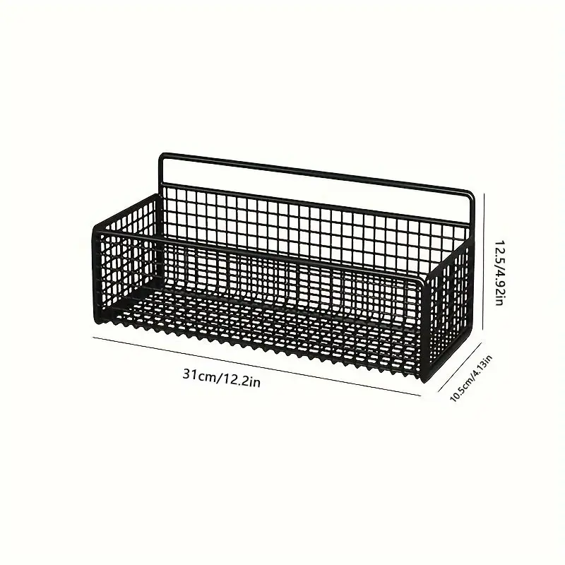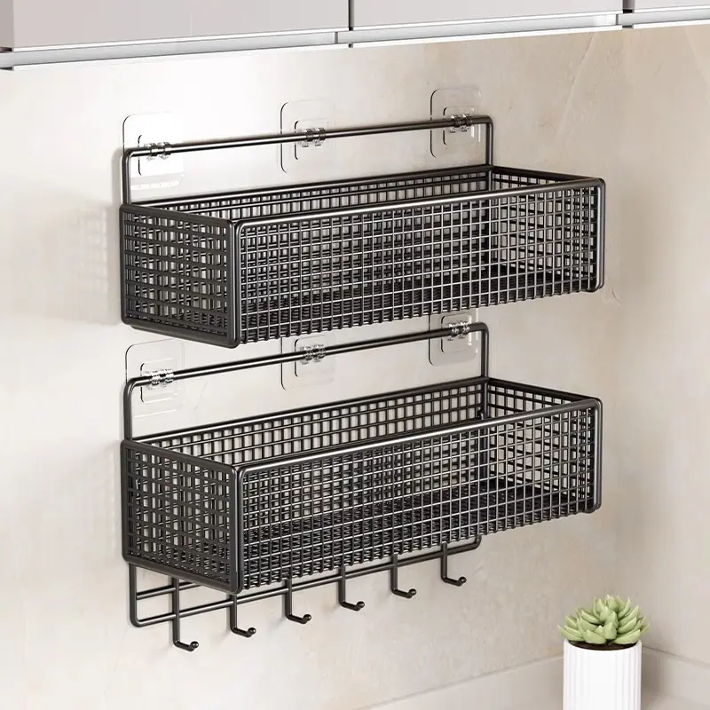 This iron storage rack is designed to help organize and hang household items in a vertical layout. The grid-style panel and hooked rail provide multiple points for hanging or arranging compatible accessories. It uses a no-drill installation method to support setup without permanent mounting. The open design keeps items visible for quick selection and routine reorganization.