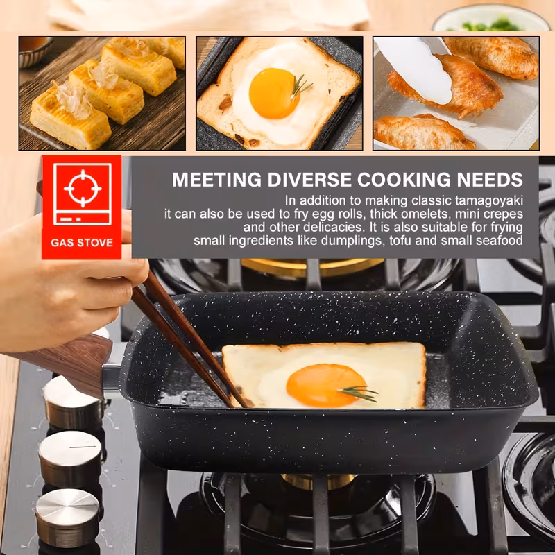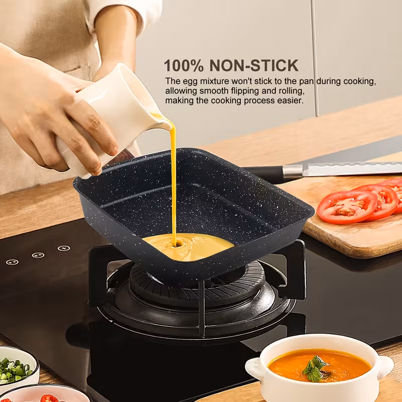 Craft perfect, restaurant-quality egg dishes with this specialized rectangular non-stick pan. Designed for precision and ease, it’s the ideal tool for creating beautifully layered tamagoyaki, fluffy egg rolls, and evenly cooked pancakes right in your own kitchen.