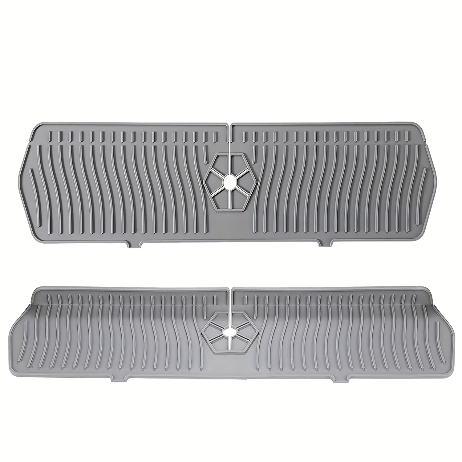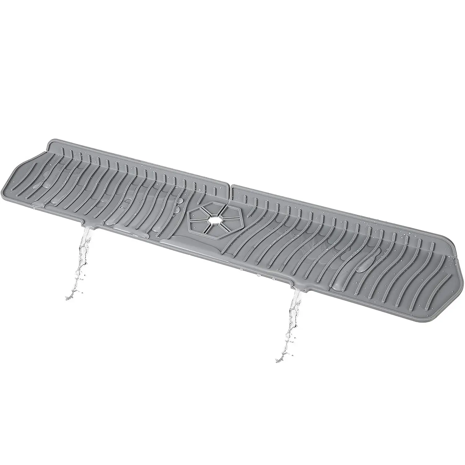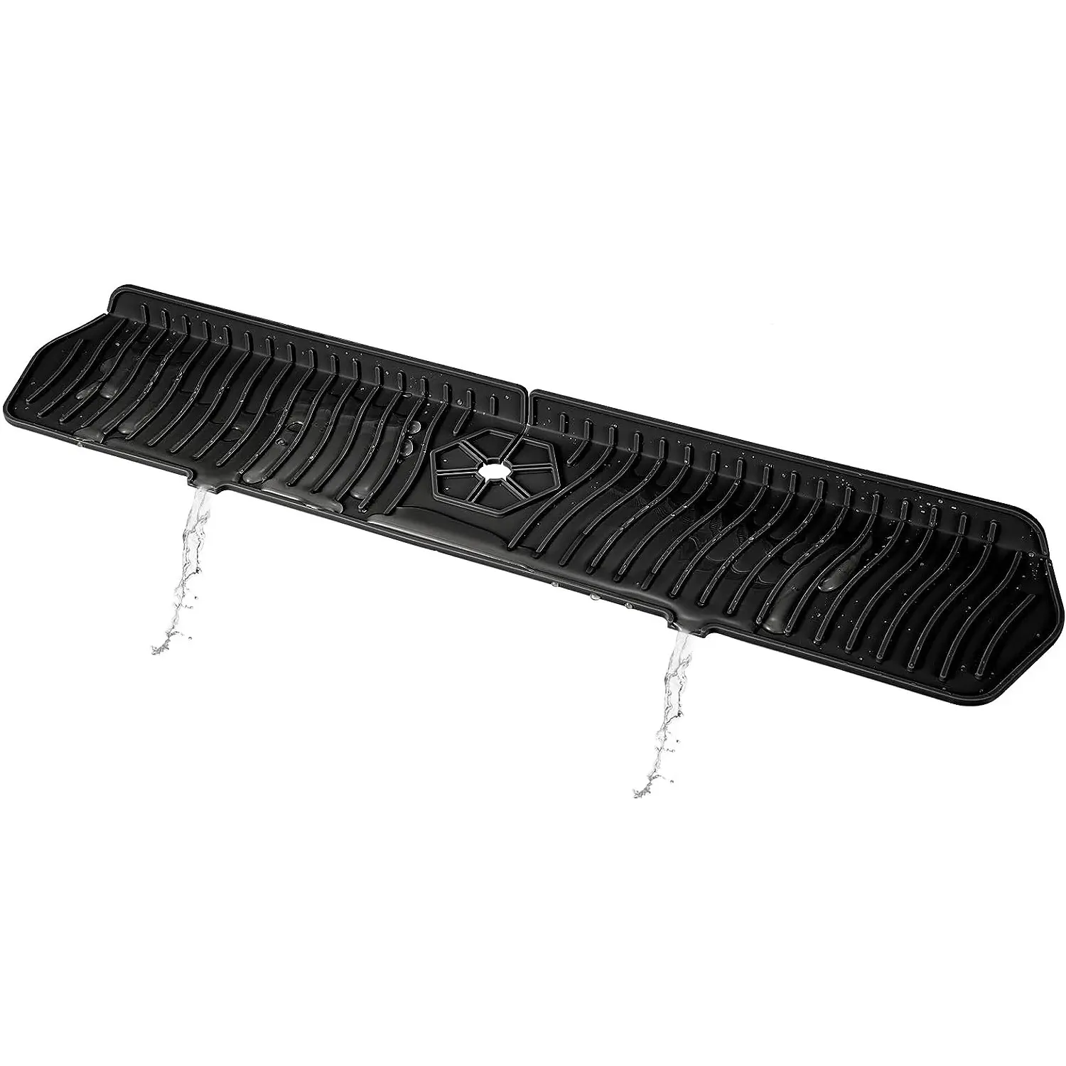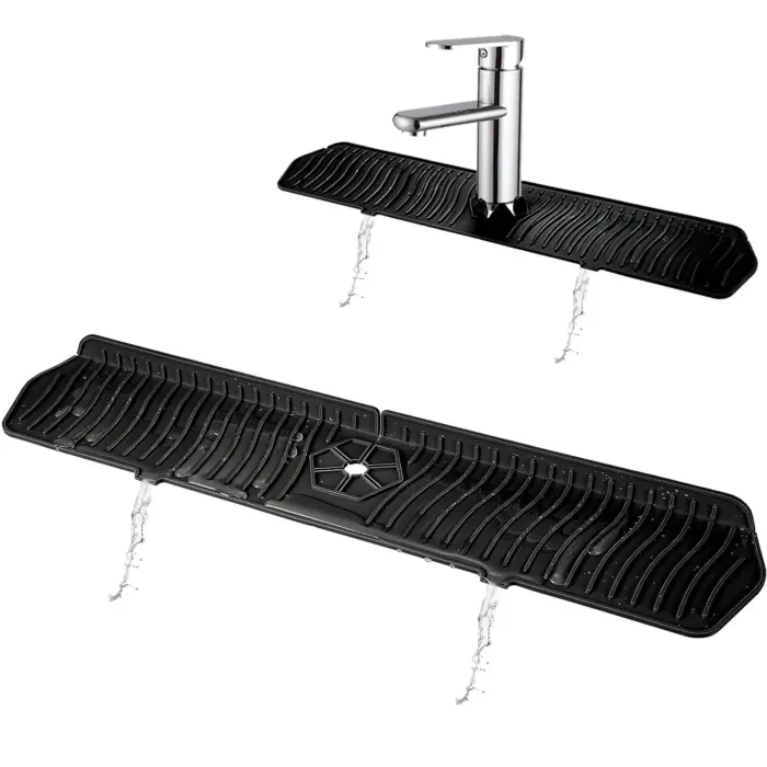 This splash guard mat is designed to sit around a faucet base to help catch drips and reduce water splashes. The flat mat surface helps keep surrounding areas drier while providing a place to rest small items during drying. Its flexible design allows it to lay flat and conform around common faucet shapes. Rinse or wipe the surface as needed for routine cleaning.