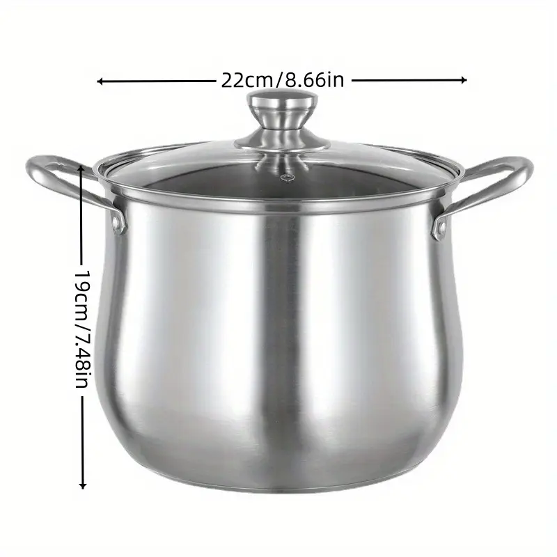 This stainless steel pot is designed for making soup, porridge, and steaming. The large-capacity form supports cooking larger portions without specifying exact volume. A metal construction is intended for repeated heating and everyday kitchen use. It is compatible with induction and gas cooking methods.