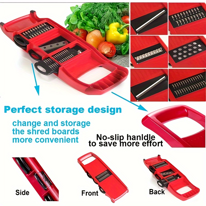 This manual food prep system is designed for slicing, chopping, and grating a variety of ingredients. It includes interchangeable blade components to support different cut styles. The enclosed container design helps collect prepped pieces during use. Use the parts as directed and clean after use for routine kitchen prep.