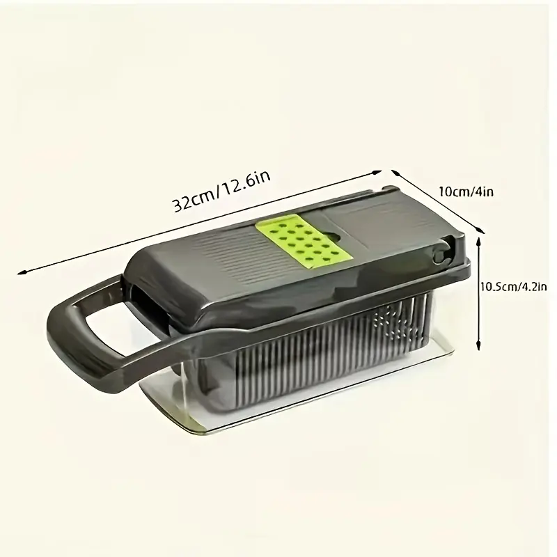 This multifunctional food chopper is designed for manual chopping, slicing, and dicing of a variety of ingredients. It includes interchangeable blade inserts and a container to help collect and manage cut pieces during prep. A strainer-style basket and drainage basket support rinsing and draining in a controlled way. The components are designed to separate for handling and cleaning between uses.