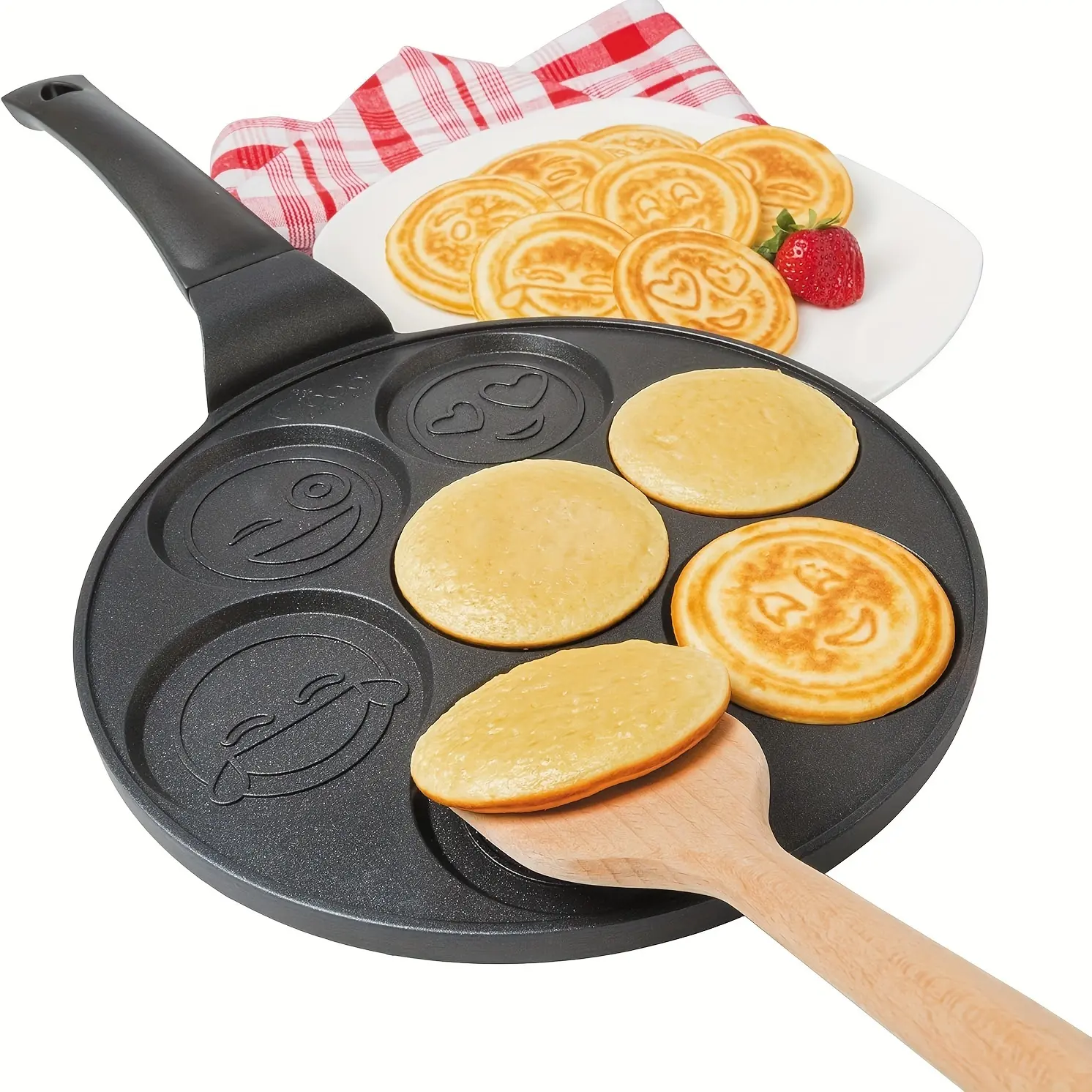This multi-cavity pan is designed for cooking multiple small pancakes or crepes in one batch. The aluminum body supports even heat distribution across the cooking surface. A detachable handle helps with handling and storage when not in use. The non-stick surface is intended to support controlled release and easier cleanup. Suitable for use on flat cooking surfaces.