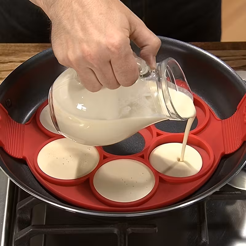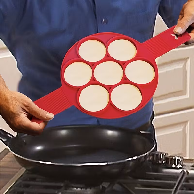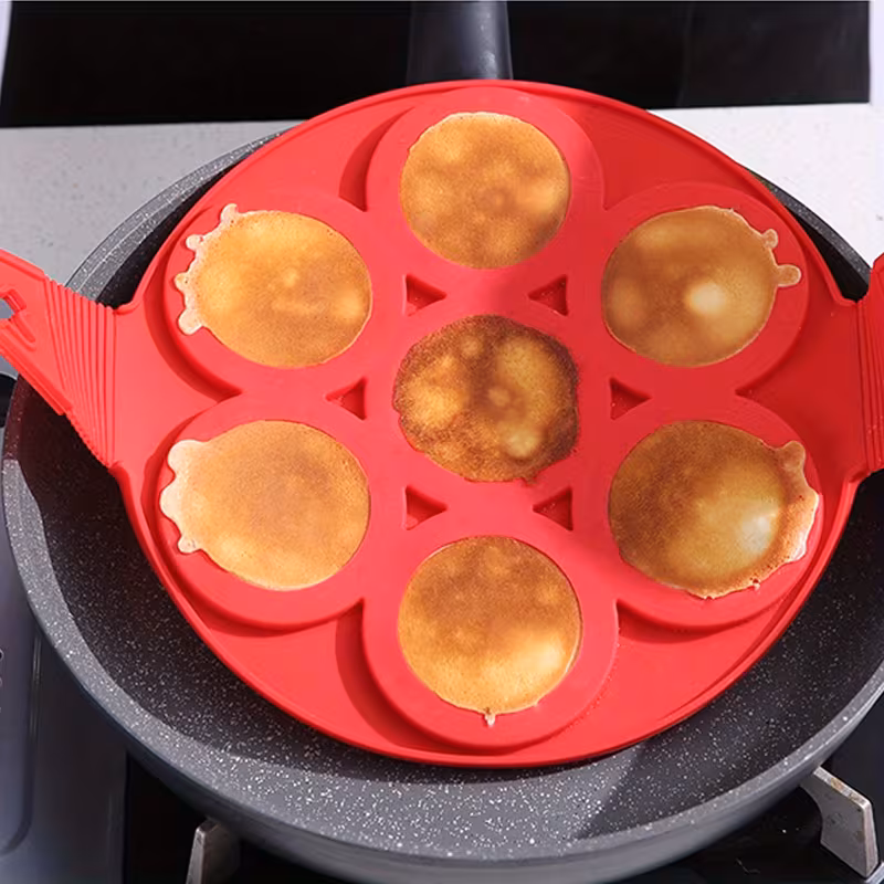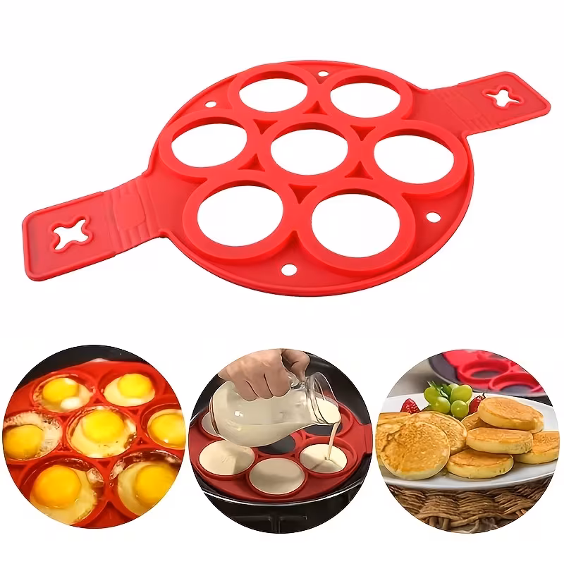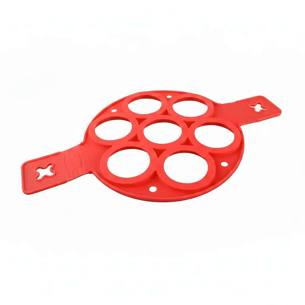 This silicone pancake maker is designed for cooking pancakes and eggs in evenly shaped portions. The multi-ring layout helps separate batter or ingredients during cooking. Its flexible silicone structure supports easy release after use. The tool is intended for routine home or food service cooking with simple cleaning after use.