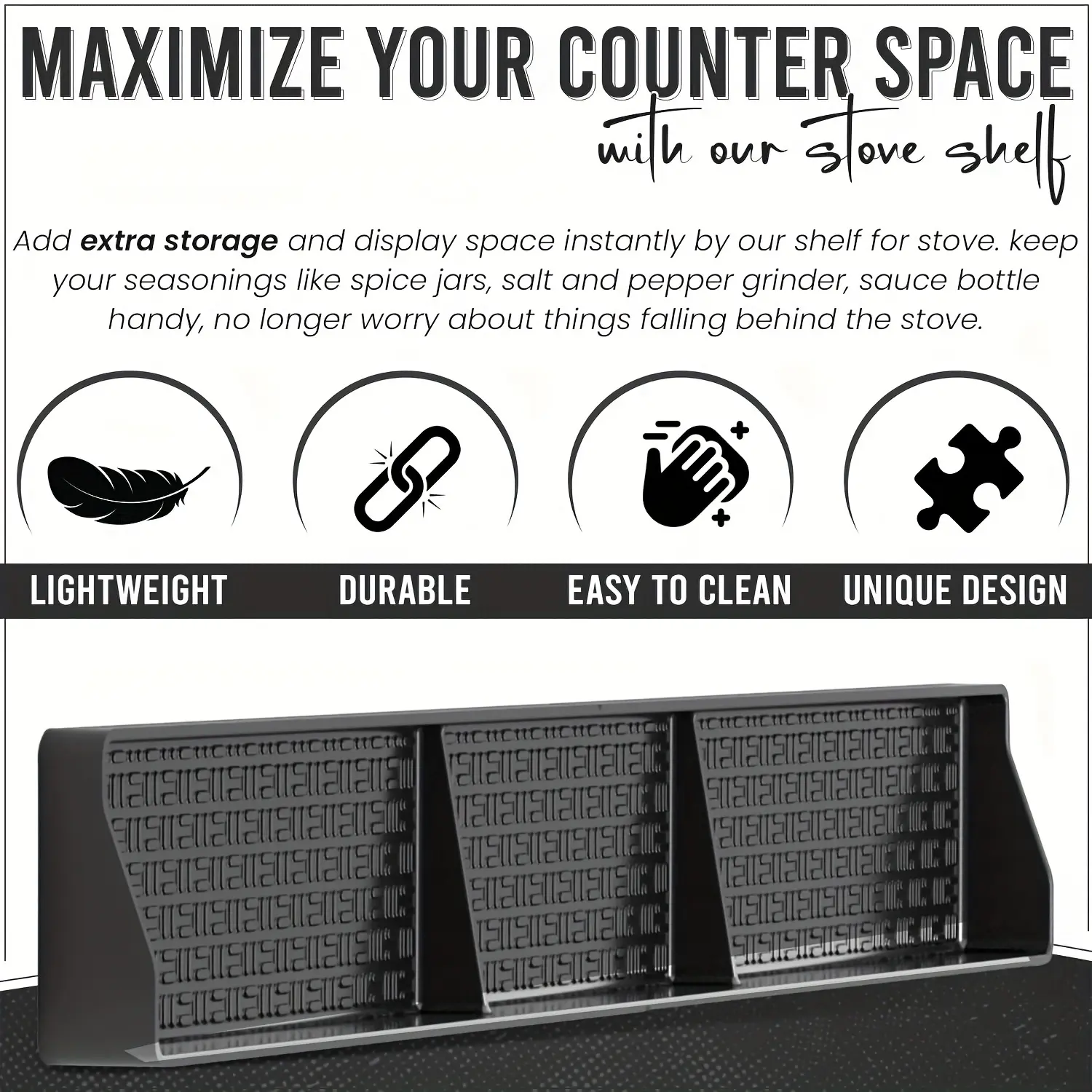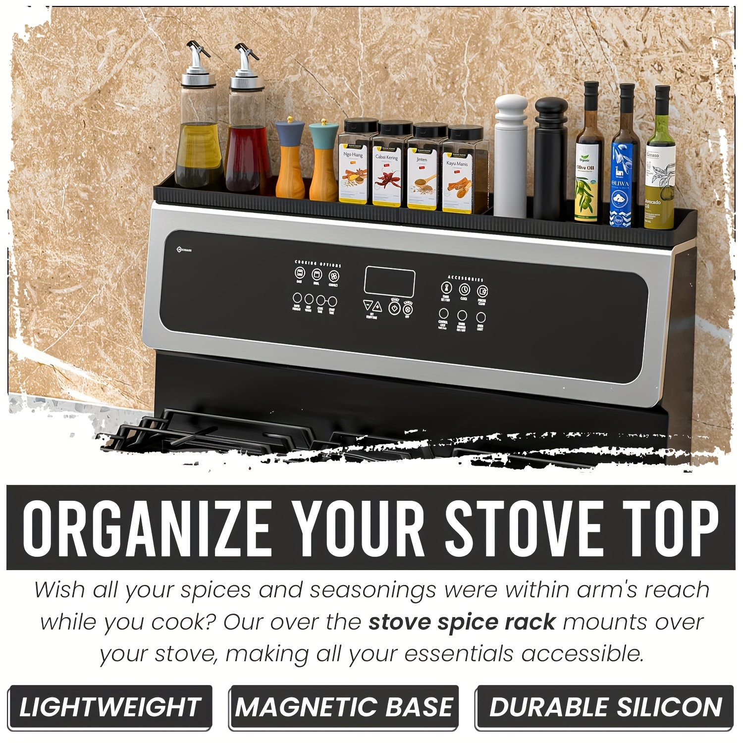 This silicone spice rack is designed to help organize small containers in a compact layout. The flexible material helps keep items positioned during everyday handling. Its low-profile shape fits into a range of storage setups without adding bulk. The surface can be wiped clean for routine maintenance.