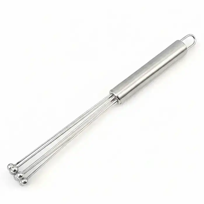 This stainless steel bead whisk is designed for manual mixing and stirring during food preparation. The bead-style head supports consistent agitation when combining liquids and semi-liquid ingredients. Its handheld form allows controlled movement without mechanical components. The metal construction is intended for repeated use in everyday kitchen tasks. This utensil is suitable for routine cooking and baking preparation.