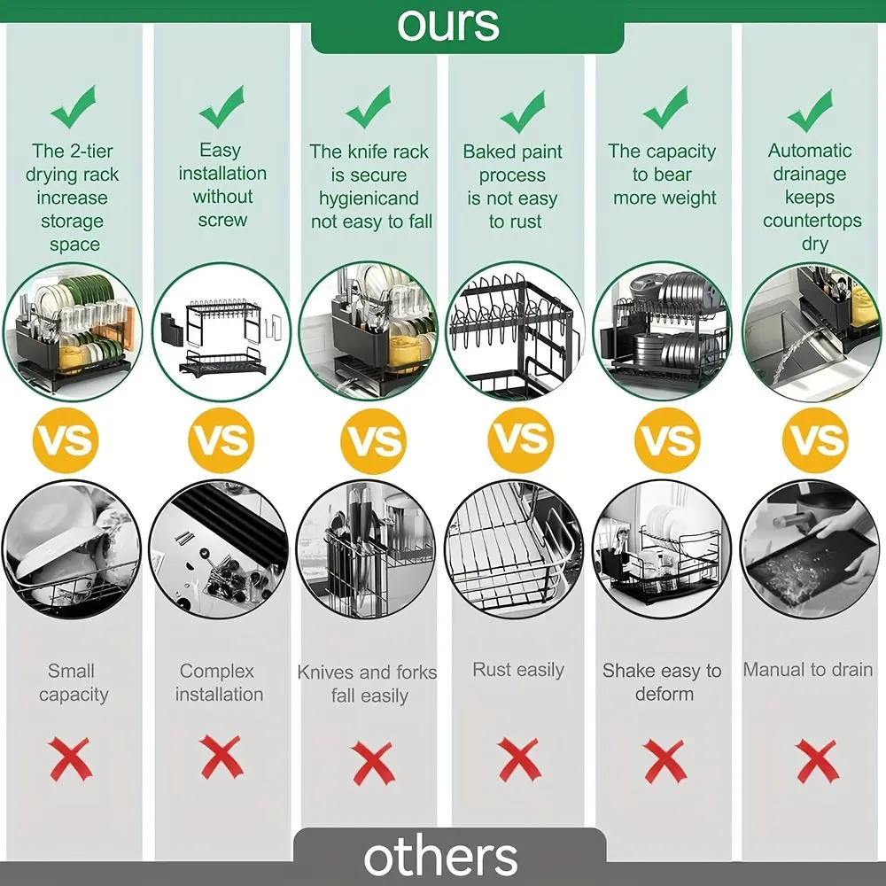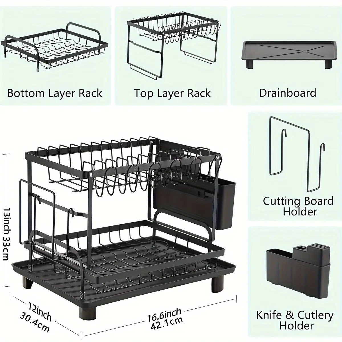 Two-Tier Dish Drying Rack for Dish Draining & Air Drying with Metal Frame and Drainboard