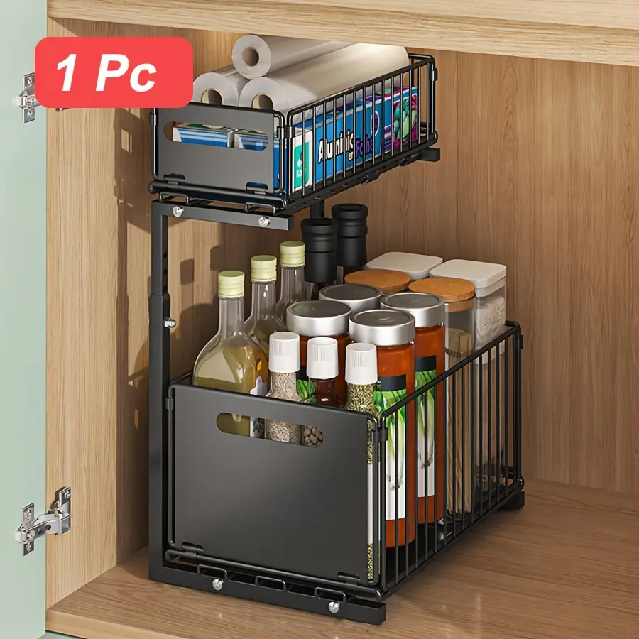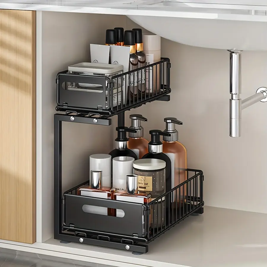 This under-sink organizer is designed to create a two-tier storage layout in enclosed cabinet spaces. The sliding structure helps provide easier access to items stored on the lower level. Its open-frame design supports visibility and airflow around stored items. The compact profile is intended to fit around common under-sink plumbing areas. The black finish provides a neutral look that blends with many interiors.