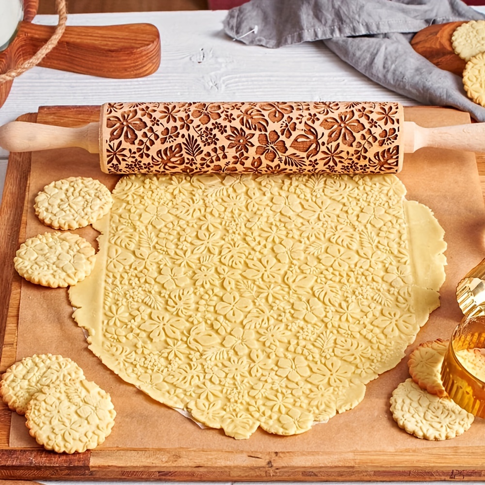 Wooden Embossing Rolling Pin for Rolling & Texturing Dough, Floral Pattern